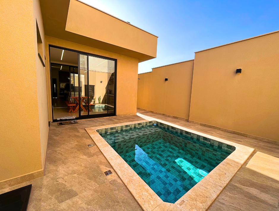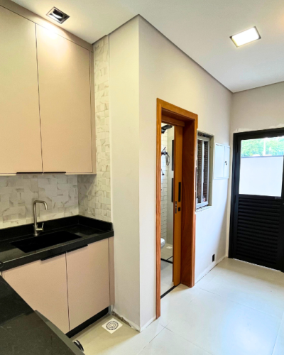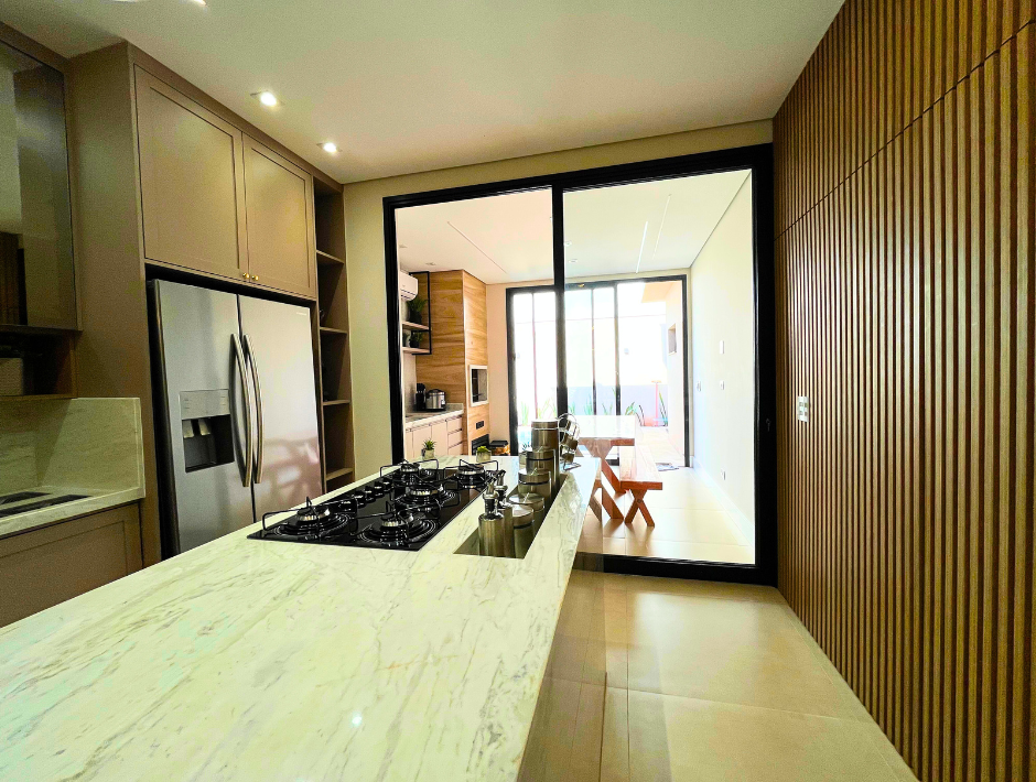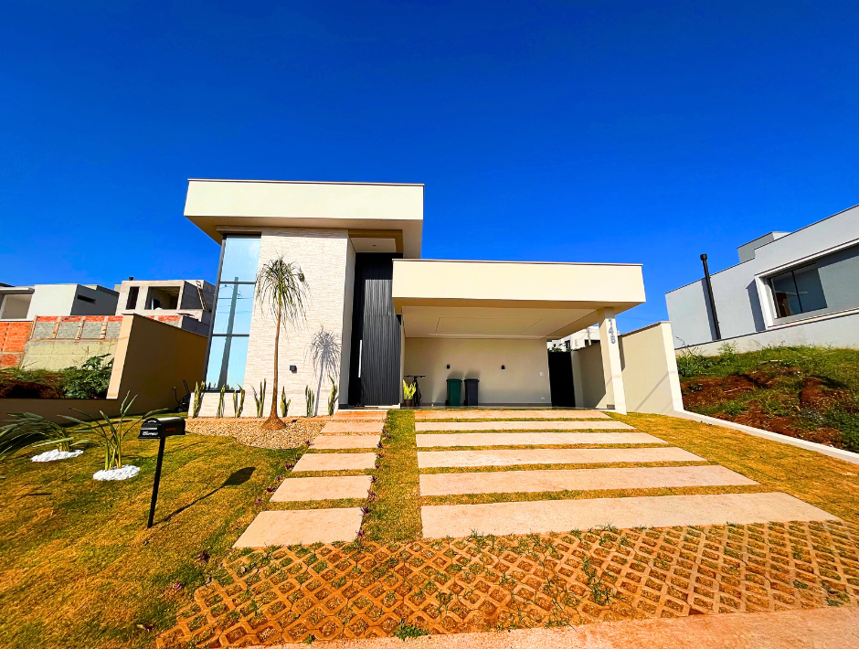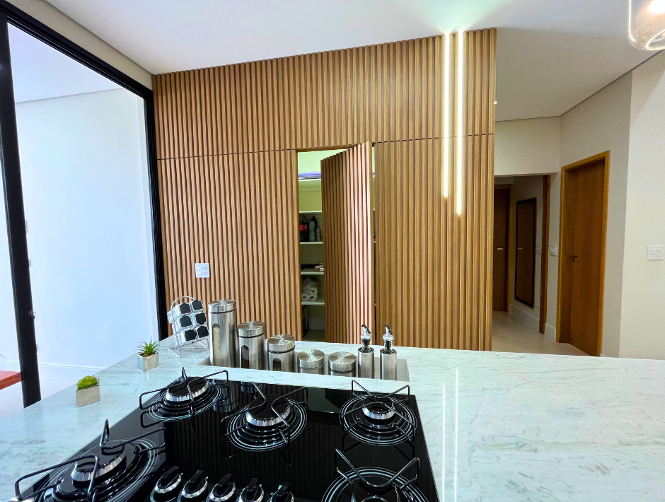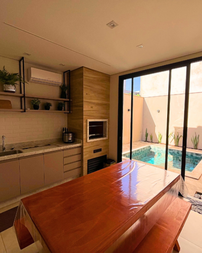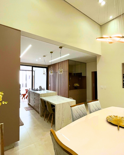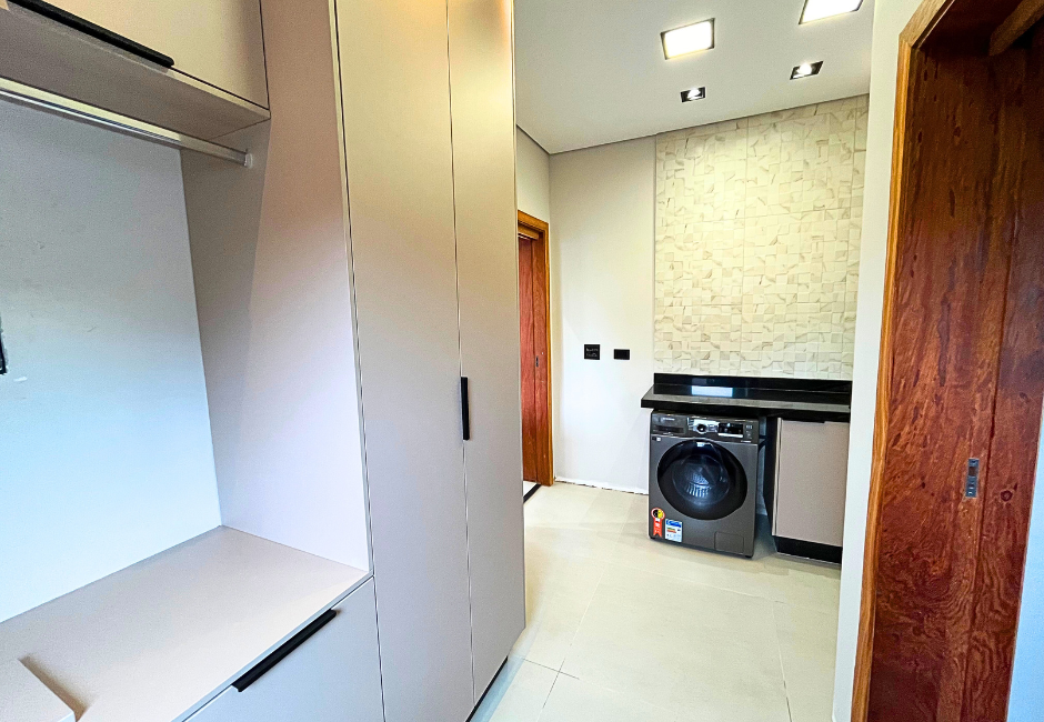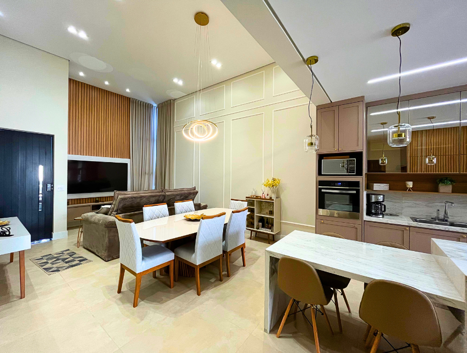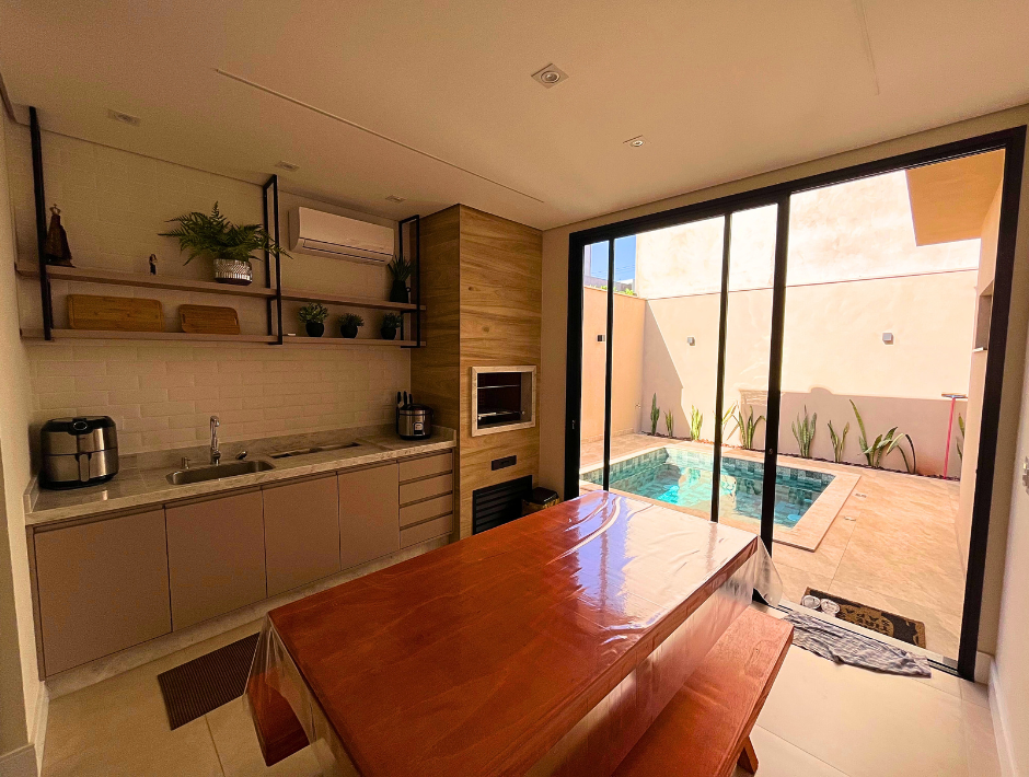 A casa apresenta sala 2 ambientes integrada com cozinha e área gourmet, lavabo, despensa e lavanderia. São 3 dormitórios, incluindo uma suíte master com closet, além de banheiro social e lavabo externo.
