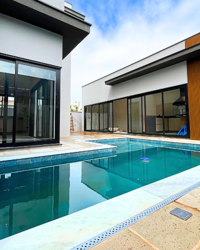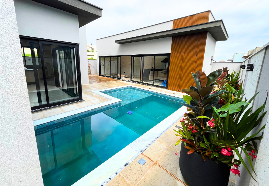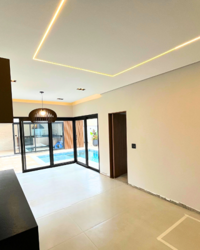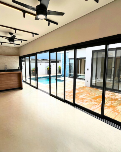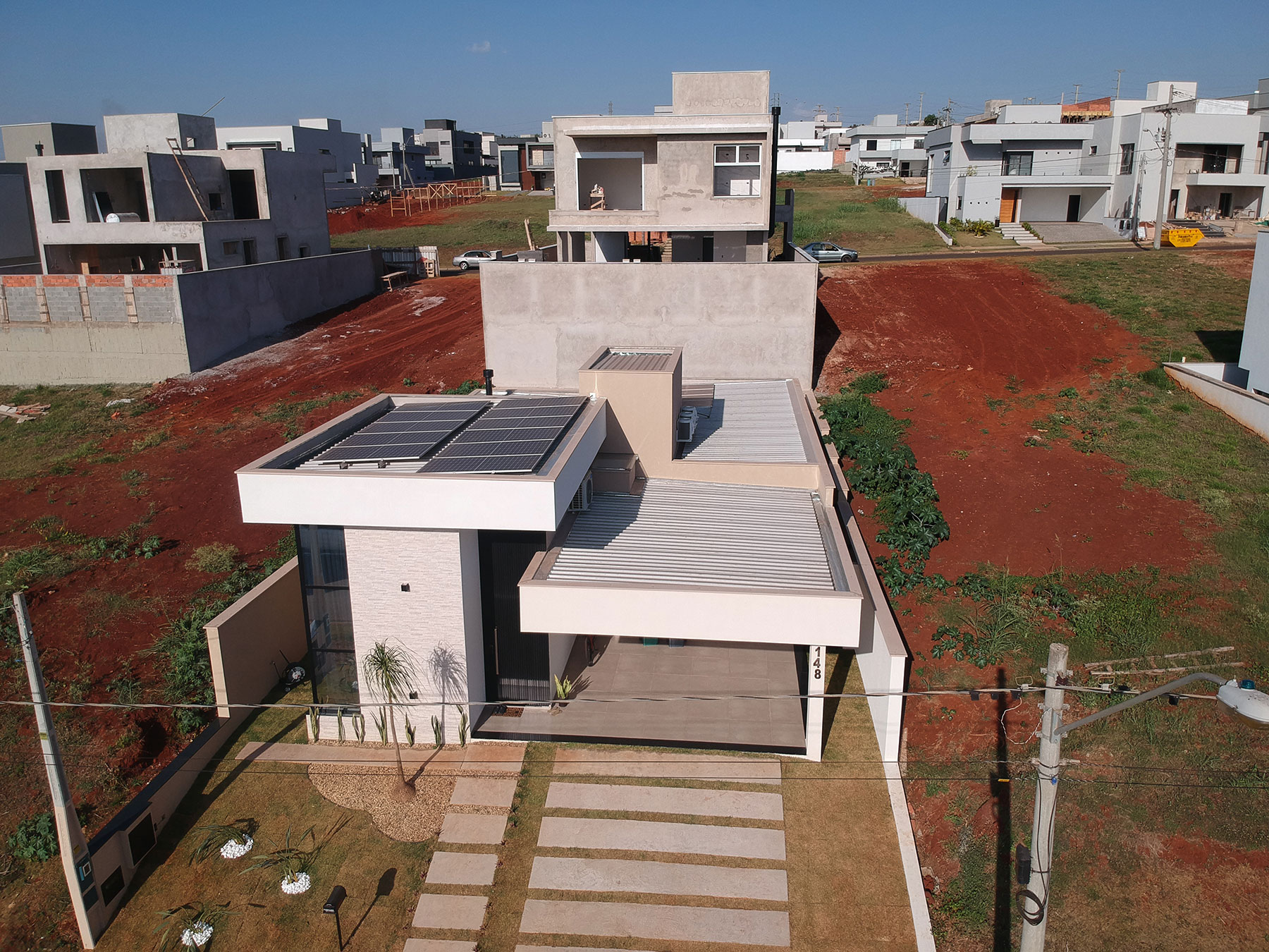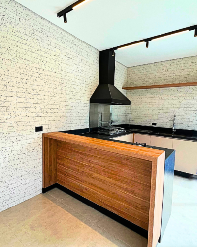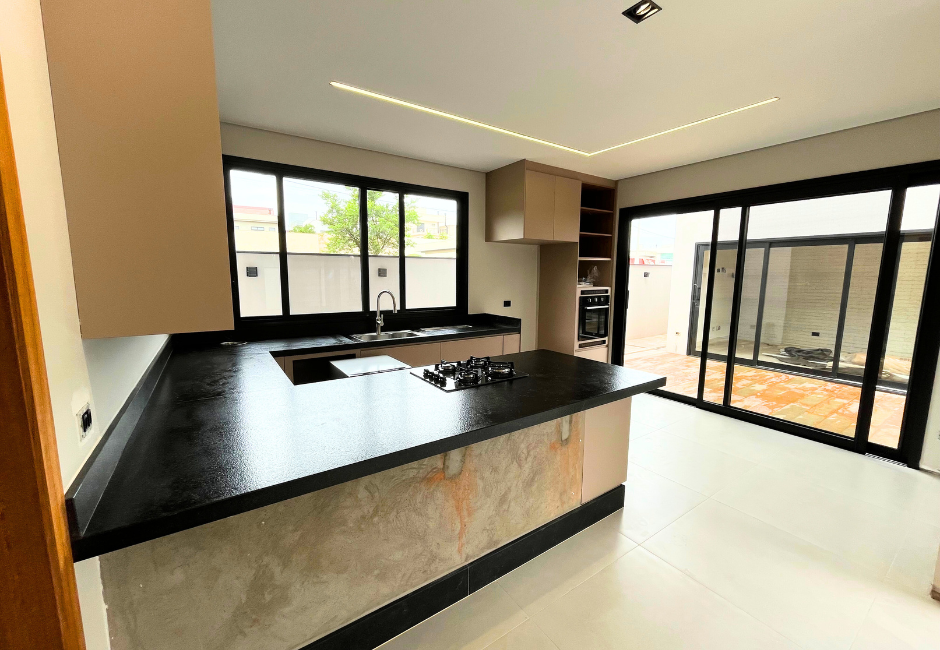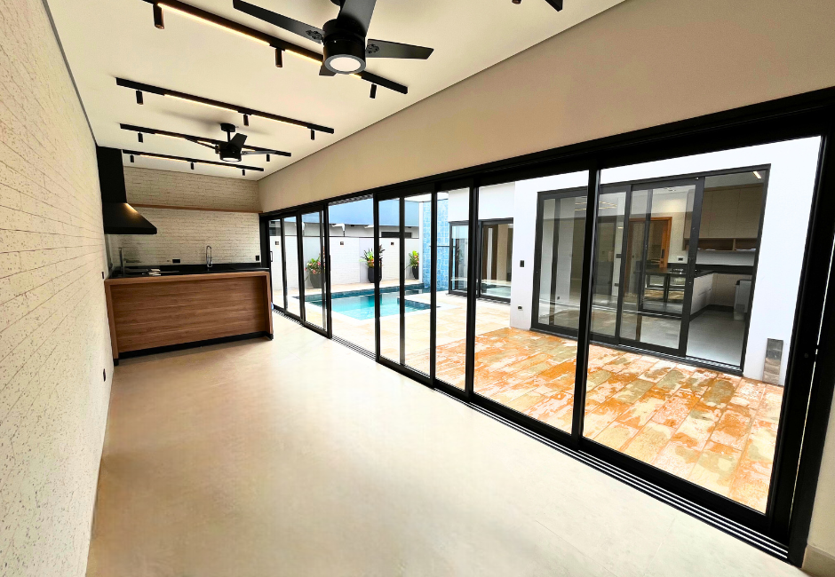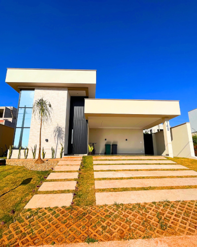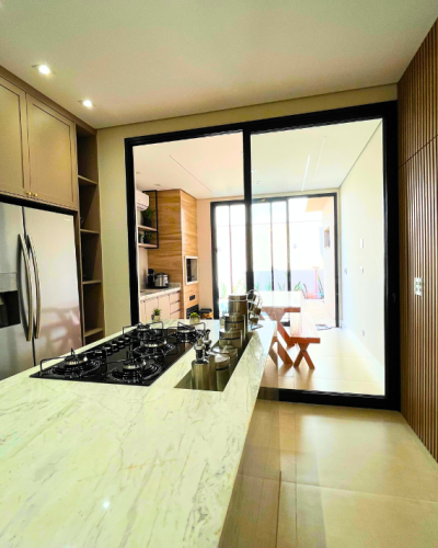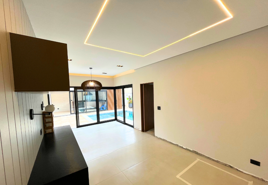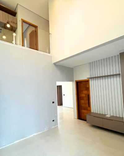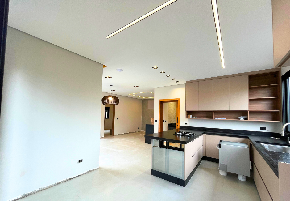 A casa apresenta sala 2 ambientes integrada com cozinha e área gourmet, lavabo, despensa e lavanderia. São 3 dormitórios, incluindo uma suíte master com closet, além de banheiro social e lavabo externo.