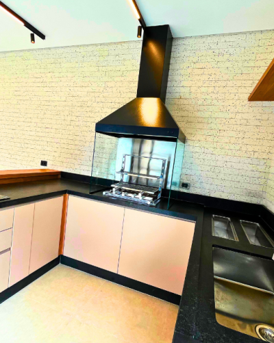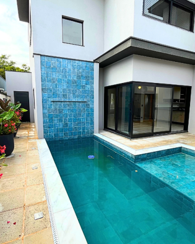 Na área externa, piscina com prainha complementa o lazer. A garagem acomoda 4 carros, sendo 2 cobertos.