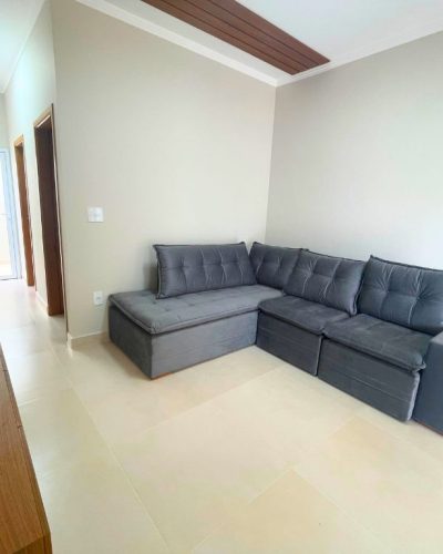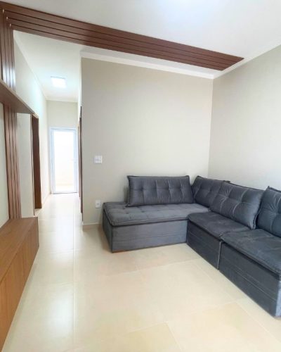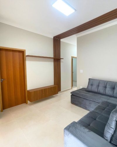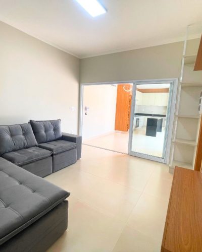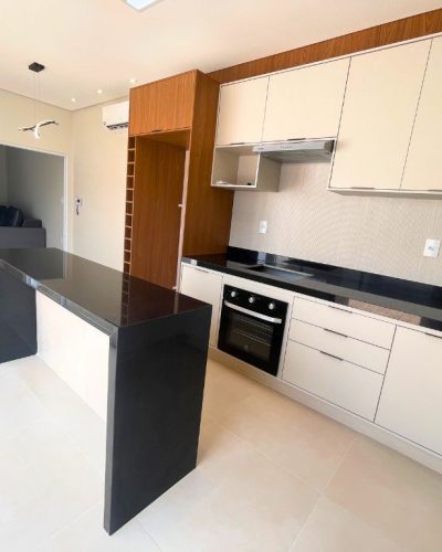 A área social reúne sala e cozinha gourmet integradas, criando um ambiente convidativo. A área íntima conta com 2 dormitórios, sendo 1 suíte master, além de despensa e banheiro social.